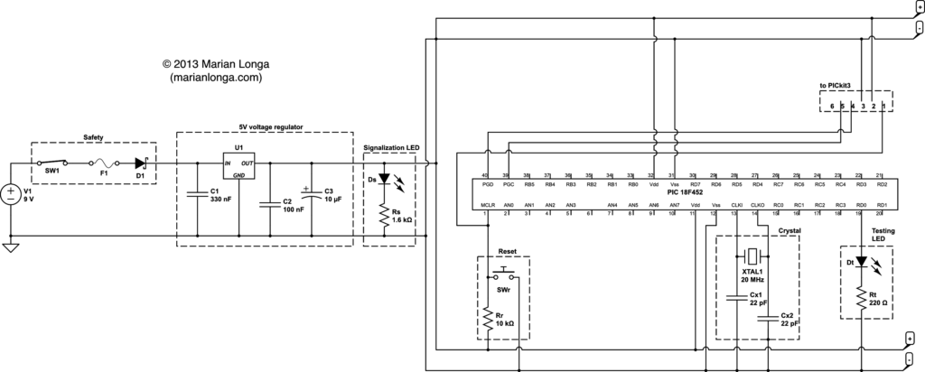 Voltage regulator is needed in our circuit to control the voltage the PIC receives. If you look into the PIC18f452 datasheet, you’ll notice that it’s a 5V microcontroller, meaning that if the voltage it receives is higher or lower than 5V, it may not function properly. And since our power supply is 9V, we must use a voltage regulator to get it to 5V. You may ask why not use a 5V supply directly, and it’s because 1. it’s hard to come by a portable 5V supply and 2. its voltage would decrease over time and would soon have to be replaced. We can solve both of these problems using, say, a 9V battery connected to a 5V power supply and even if the battery’s voltage would decrease to, say, 8V, the microcontroller would still receive the 5V. And why don’t we use a 6V battery (4xAA) instead of the 9V one? Well, one of the drawback of voltage regulators is that they also have a large (around 1V) voltage drop and when we account also for voltage drops on other parts, such as the diode, we find that the total voltage drop can reach 1.5V to 2V. So, to get a steady 5V supply, we need to use at least around 7V battery. Also, when you’re going to use a voltage regulator, be sure to check the values of capacitors it needs in its datasheet. In the datasheet, there’s often a circuit of how the regulator should be wired up in a circuit. For my voltage regulator, the capacitor values are 330nF which is placed before the regulator, 100nF which is placed after it and another 10µF one which is also placed after the regulator (for the values of capacitors used with a popular “7805” voltage regulator, see page 7, Figure 1 in its datasheet.) See the schematic under the article.