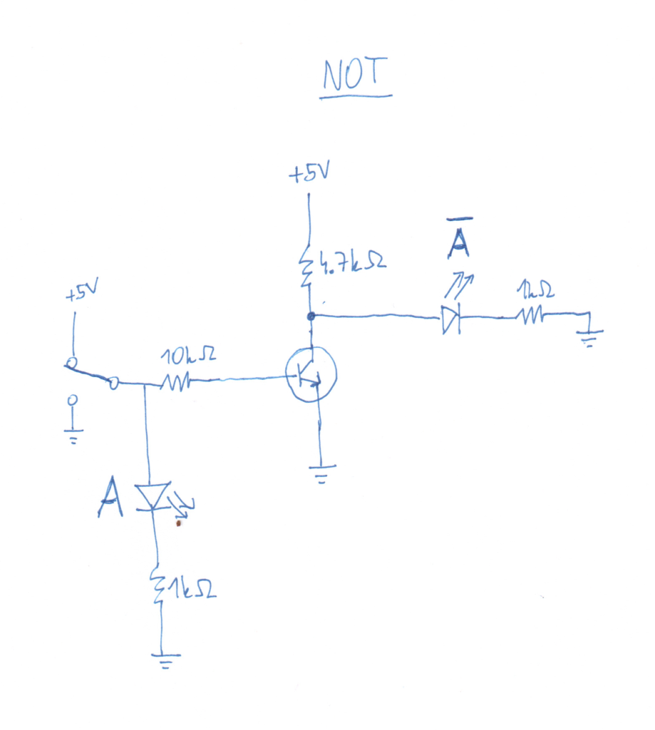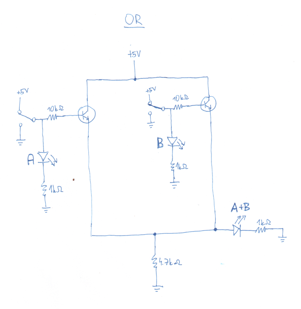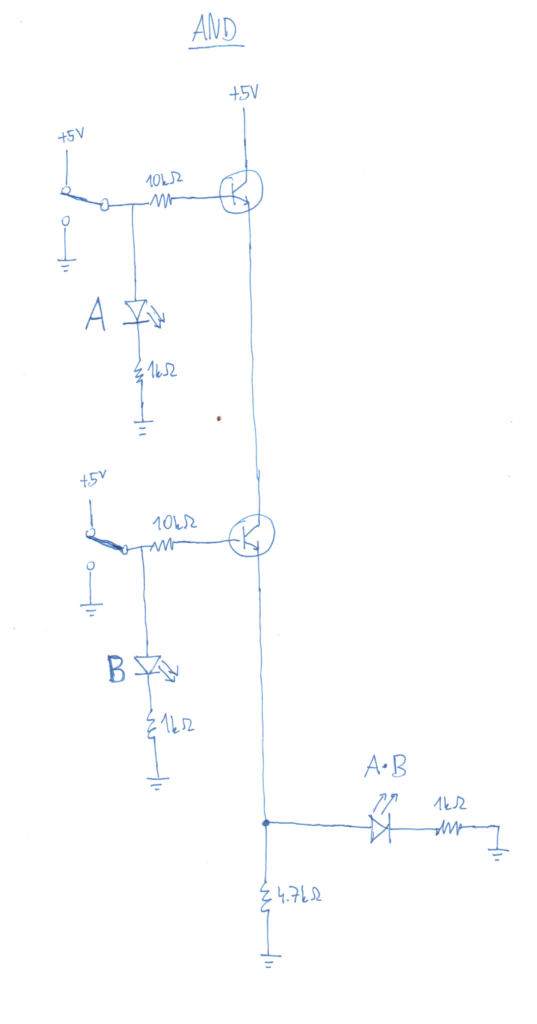 To make this gate in practice, I’ve drawn a schematic below of these 2 transistors connected in series (click on the image to enlarge). The first one, on the top, has its collector connected to , then its emitter is connected to the second transistor’s collector, and the second transistor’s emitter is connected to ground (through a 4.7kΩ resistor to prevent a short circuit in case both transistors would have a zero resistance). The base of each transistor is connected through a switch to an input voltage of either +5V or ground, representing binary 1 and 0 respectively. There’s a 10kΩ resistor between the input voltage and the base of each transistor to limit the amount of current flowing through its base (from the input voltage to the ground).1 To indicate whether input A is binary 0 or 1 (i.e., whether the base of the first transistor is connected 0V or +5V), an LED marked A is connected to the input voltage through a 1kΩ resistor to the ground. If the base of the 1st transistor is connected to 5V, the LED would light up because it would also be connected to 5V. Otherwise, if the base is connected to 0V, the LED wouldn’t light up because there’s no potential difference across it. Therefore, this LED A serves as an indicator of the state of the first input A, and the same goes for LED B. Similarly, to indicate whether the output A AND B is binary 0 or 1, an LED