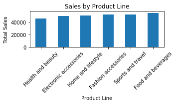Let’s say we now want to compare the sum total of sales across different product lines. We can do that by first grouping the sum of the Total column by the product line, and then sorting the sales as: