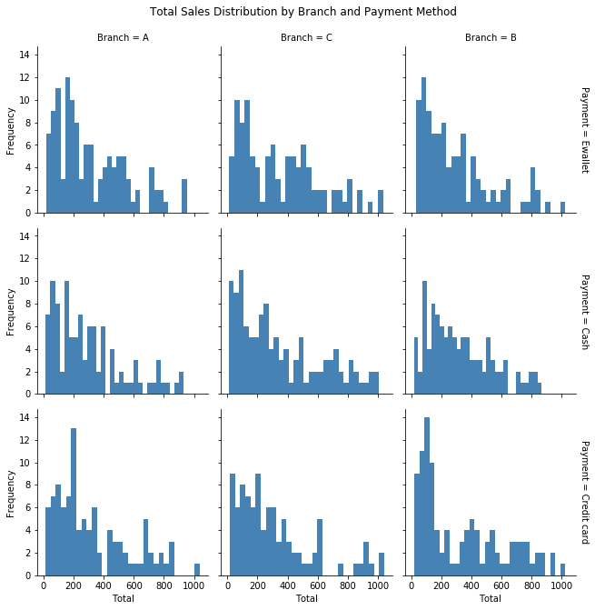 Finally, we can visualise a facet grid plot of some function of data for different values across the rows and columns of the plots. For example, here we visualise the histogram of total sales across different branches and payment methods: