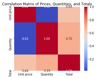 plt.title('Correlation Matrix of Prices, Quantities, and Totals')