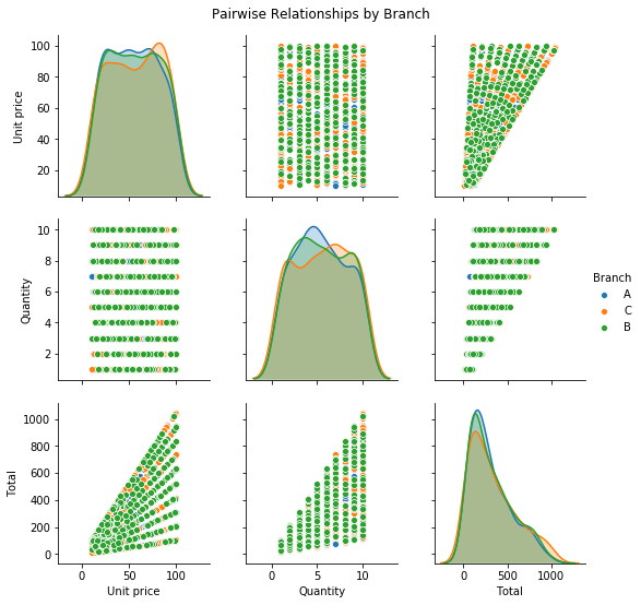 Next, if we want to investigate the relationships between multiple variables we can use the pair plot, in this case showing how unit price, quantity and total are related for different branches. We can see that higher unit prices and quantities lead to higher total sales.
