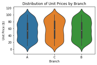 We can create more advanced and better looking plots of data with the Seaborn library that builds on top of Matplotlib. For example, we can create violin plots showing the density of a variable, pair plots showing the relationships between multiple variables, and heatmap plots for visualising correlations. Firstly, we can create a violin plot that visualises the distibutions of variables, in this case comparing the distributions of unit price across different branches: