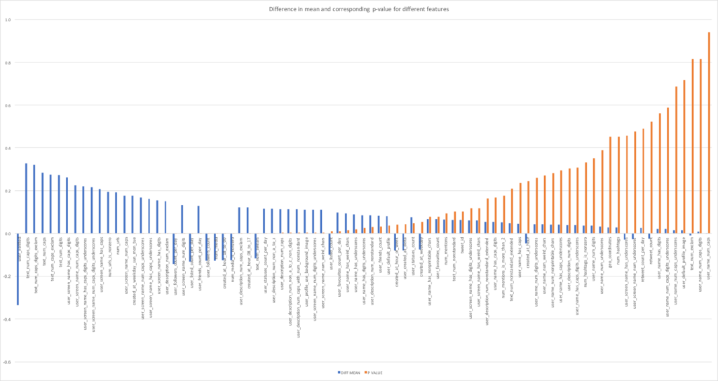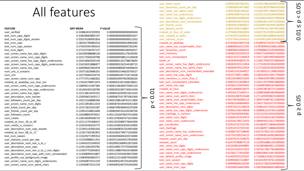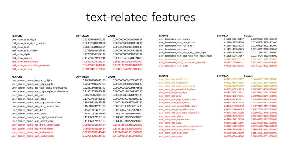 Although this project focuses primarily on classification of tweets based on their metadata as opposed to using natural language processing (NLP) on the tweetâs contents, I have engineered a few text-related features which do not analyse the meaning of the words in the text but instead focus on the âtext metadataâ related to the tweetâs contents, such as number of capital letters in the tweetâs content, whether the user screen name has digits, or the number of exclamation marks used in the userâs description. All of the text-related features are summarised in the image below. One of the best features turned out to be the combined number of capital letters and digits in the tweetâs content (with very high normalised difference in mean and extremely low p-value of â”=0.329, p=1.8e-17) and whether the user screen name contains capital letters or digits (â”=0.262, p=1.18e-11). Features shown in black are statistically significant (p<0.01), features shown in red are not significant enough (p>0.05) and features shown in orange are possibly significant (0.01