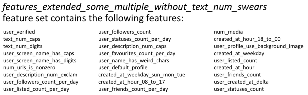 For completeness, the chosen feature set features_extended_some_multiple_without_text_num_swears contains the following features (you can check models.py for more information).