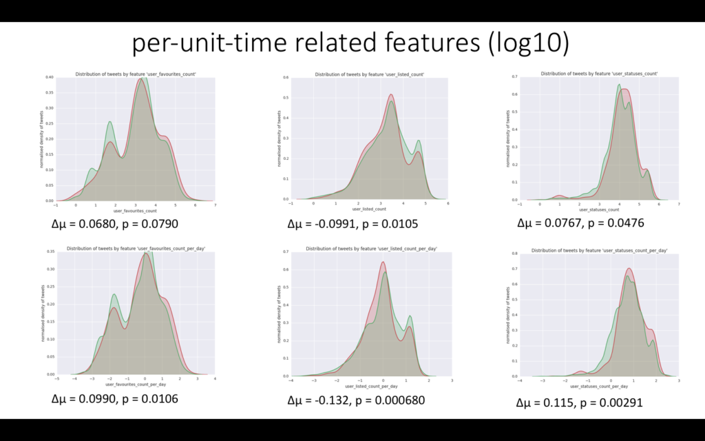 Some of the features in the dataset are also continuous, such as retweet_count which describes how many times a particular tweet was retweeted, user_followers_count which describes how many followers the posting user has, etc. Since the normalised tweet density might vary greatly with the feature value, I have plotted the densities using KDE plot (Kernel Density Estimation plot) which smoothes out the density curves. Also, since the values of these features span multiple orders of magnitude, the x-axis was logged (log10 of the feature value). You can see some of the continuous features below, each with a corresponding per-unit-time feature which was made by dividing the original feature by the number of days the tweet has been up (if the original feature is about the tweet) or divided by the number of days the user account has been up (if the original feature is about the user) â itâs best to see the graphs themselves for an example. Some interesting features turn out to be user_friends_count_per_day, user_followers_count_per_day, user_listed_count_per_day and user_statuses_count_per_day, each of which has a high â” and low p-value. For example user_statuses_count_per_day gives the number of tweets the posting user publishes in one day, and this number turns out to be significantly different for fake news tweets and other types of tweets.