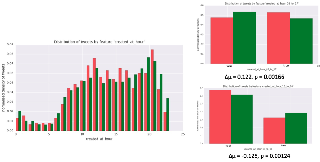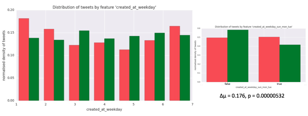 One more interesting feature I have engineered turned out to be created_at_weekday which extracts the (local EST) weekday when the tweet was published. It turned out that most fake news are published over Sunday, Monday and Tuesday, and so I made a corresponding binary feature created_at_weekday_sun_mon_tue which is true when the tweet was published during those days and false otherwise. It turns out that this feature is pretty good (it has a high â” and low p-value).