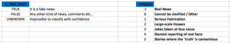 However, for a supervised machine learning model to learn from the data, we needed to manually annotate the tweets in the dataset as fake news or not or unknown (and if it is fake news, also choose which category of fake news it is). Given 9000 tweets, my supervisor has decided to give me 4500 tweets to annotate, which he said should take around 3 days of full work but turned out to be more like 2 weeks. Annotating them was not a trivial process â for each tweet I needed to read the content of the tweet (the text field), check the links to external websites or other tweets mentioned in the given tweet, and perhaps consider the username of the posting user. However, I often had to do further research on the content of a tweet to check if it isnât made up and is in fact factually correct by reading around the topic of the tweet on external websites like PolitiFact or reliable news sources. Therefore, the process was very slow. The image below shows the types of labels we have used â first is_fake_news describes if the tweet is fake news or not and then category specifies a subcategory of fake (or real) news.