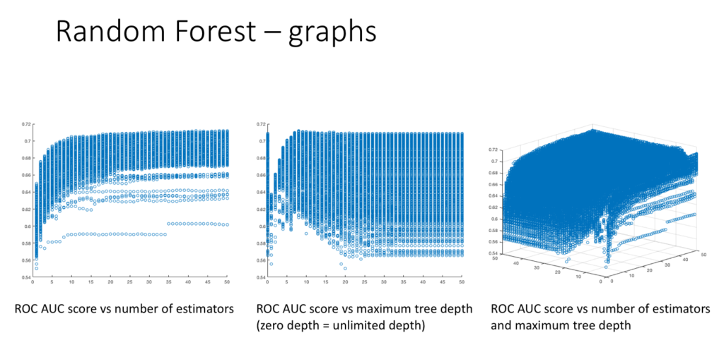 For random forests, the hyperparameters which were varied are as follows. The number of estimators (trees) used was varied from 1 to 50, the maximum tree depth was varied from 1 to 50 + unlimited, the minimum number of samples required in a leaf was varied from 1 to 25, and the maximum number of features to use when looking for a split was looped through {â(n), log_2(âĄn), 0.5 n, n}. The first few results are shown below.