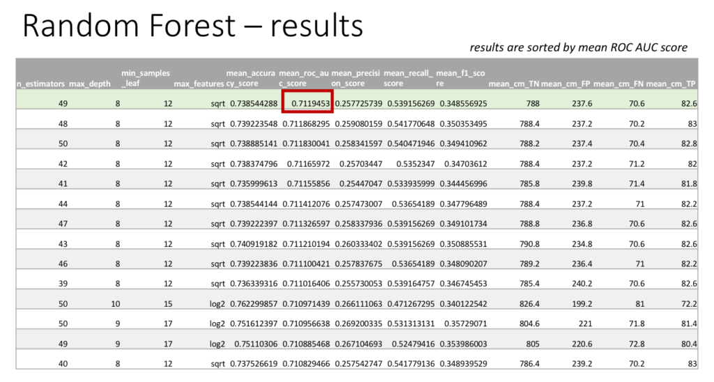 The best set of hyperparameters turned out to be number of estimators = 49, maximum depth = 8, minimum samples in leaf = 12, and maximum number of features = â(n). For this configuration, the ROC AUC score was 71.2% and the accuracy was 73.9%, which are scores that are much higher than for all the other classifiers. An interesting observation is that when the maximum number of features used is log_2(âĄn) instead of â(n), the accuracy score increases by 2.4% to 76.2% while there is only a marginal drop in ROC AUC score by 0.1% to 71.2%, which might perhaps be a preferable tradeoff.