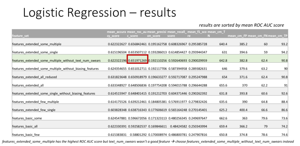 As described earlier, logistic regression will be used with different feature subsets to see which subset leads to the best classifier performance in terms of the ROC AUC score. The parameters for logistic regression used are the liblinear solver and l1 penalty. Below are the resulting scores for each feature set sorted by ROC AUC score. The scores include accuracy, ROC AUC, precision, recall, f1, and contain the terms of a confusion matrix in the order TN, FP, FN, TP where T=true, F=false, P=positive, N=negative. The best feature set by ROC AUC score turned out to be features_extended_some_multiple but one of the included features (text_num_swears) seemed to be overfitting the data so a related feature set features_extended_some_multiple_without_text_num_swears was chosen instead, which doesnât contain this feature. The same feature set will later be used for all the other classifiers for comparison. Note that for logistic regression, the ROC AUC score turned out to be 65.2% and accuracy 62.2%, so although the classifier is not perfect, it is better than random chance!