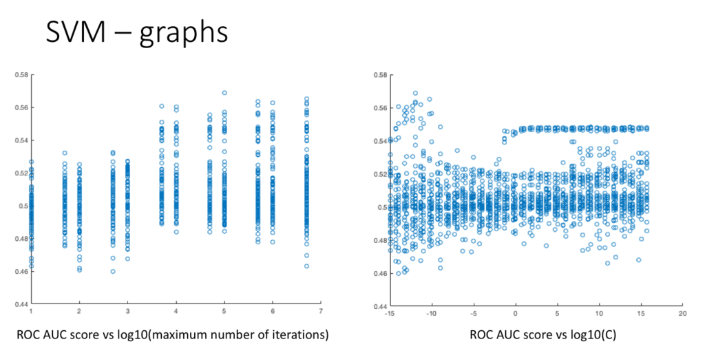 Also, below are some graphs that I have plotted from the ~5000 results. It perhaps seems to suggest that after a certain value of number of iterations (maybe #iter > 1000), the exact value of number of iterations doesnât matter because the ROC AUC scores tend to be roughly similar. Also from the second graph, the highest values of ROC AUC score seem to be produced for C †10^-10 but they donât seem to be very stable.
