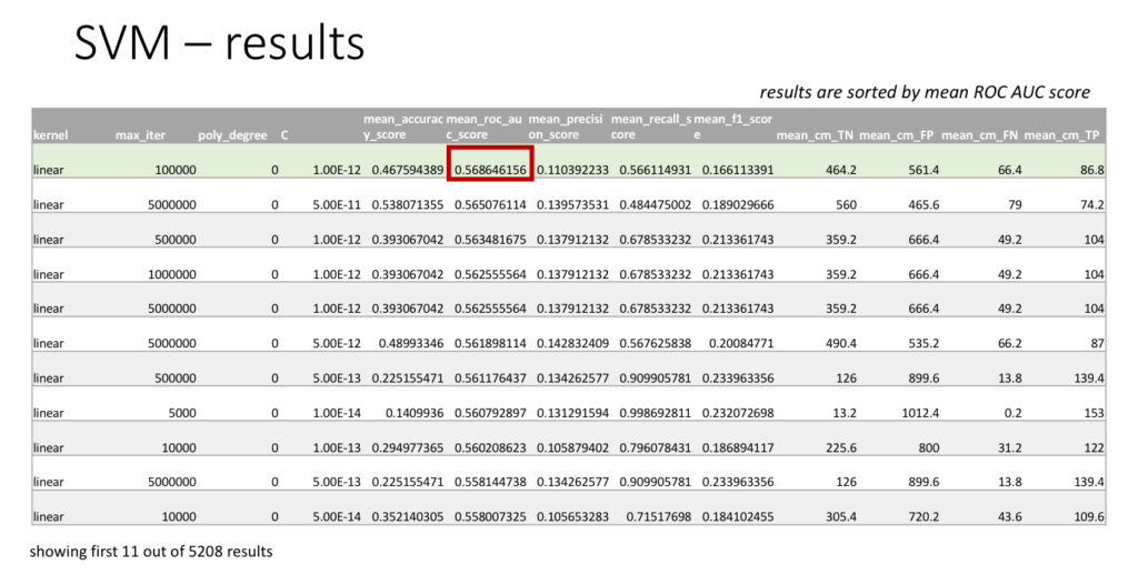 Shown below are the first 11 rows of all the 5208 SVM results, sorted by ROC AUC score. The best set of hyperparameters turns out to be linear kernel, maximum number of iterations = 100000 and C = 1e-12, for which the ROC AUC score is 56.9% and the accuracy is 46.8%. Note that these scores are much lower than the scores for logistic regression. Also, the best SVM results here tend to use linear kernel with C value of around 10^-12, while the maximum number of iterations doesnât seem to be that important.