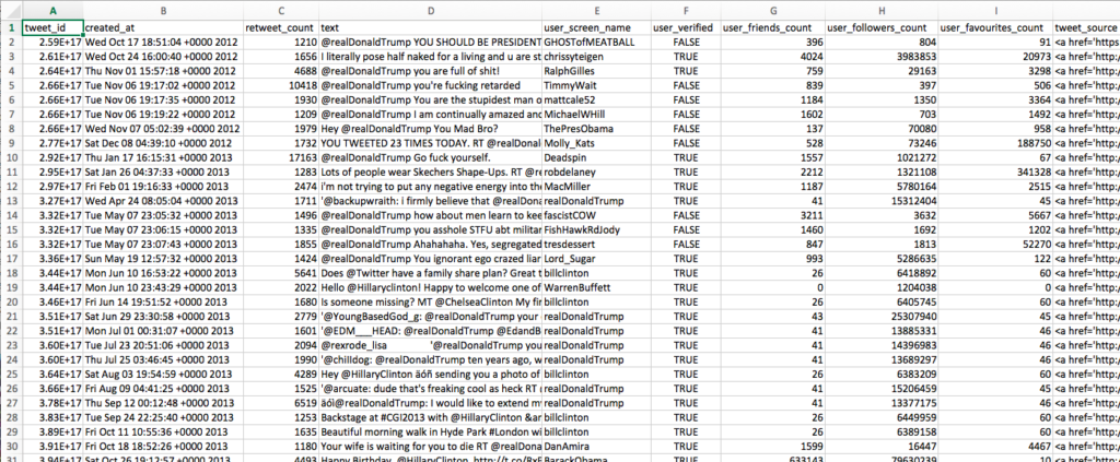 This is where my work relevant to the fake news project actually began. Every supervised learning application requires an annotated dataset which contains a list of features and a corresponding label for the ML algorithm to learn from. In this case the features were the metadata about a particular tweet such as number of retweets, number of URLs included in the tweet, number of followers the posting user has, etc., and the labels were if the tweet was fake news or not. To obtain our dataset, my supervisor has used the Twitter API to pull a few hundred thousand tweets related to the 2016 US election into a MongoDB database and then used a Python script to filter them down to around 9000 by selecting only the ones which were viral (i.e. those with retweet count higher than 1000) and only those which were the original tweets (i.e. the dataset didnât include retweets of a given viral tweet). Thus, we ended up with only original viral tweets about the US election, and these were likely to contain many instances of fake news as intended. Hereâs how a subset of the tweets data looked like â each row corresponds to a different tweet and each column contains a different feature (metadata field).