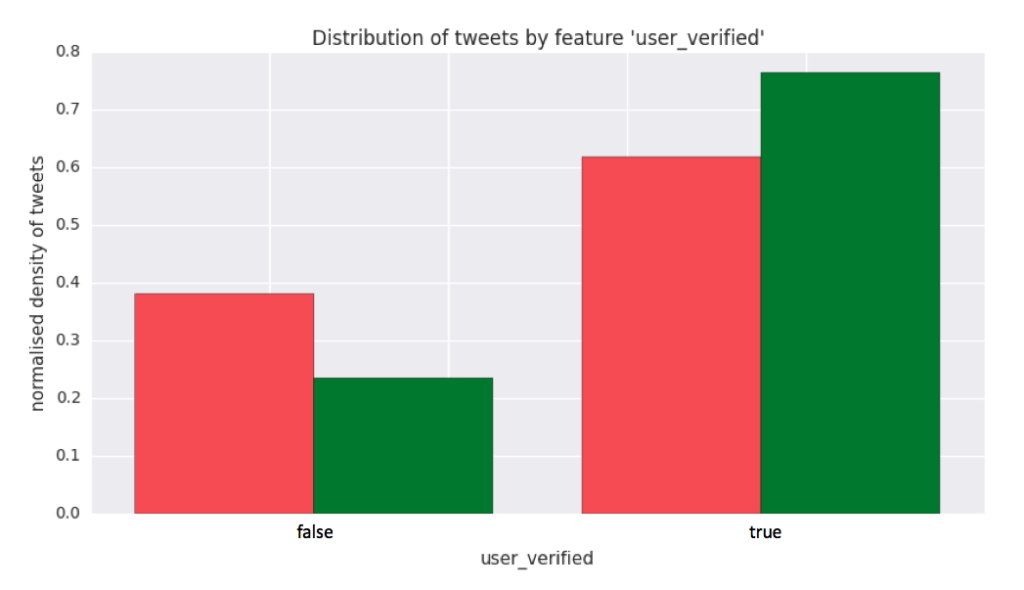 Having the annotated dataset, I was now ready to visualise and analyse the data. First, I have made a script (`stats_plots.py`) to plot all the discrete features on a histogram by their class, each showing the normalised density of tweets for each discrete value of the feature. For example for the feature user_verified whose value represents if the user posting the tweet has a verified account or not, the plot of normalised tweet density vs feature value is shown below. From this you can see that if the posting user is verified, the tweet is more likely to be âother newsâ (green bar) than âfake newsâ (red bar), and the converse if the user is not verified.